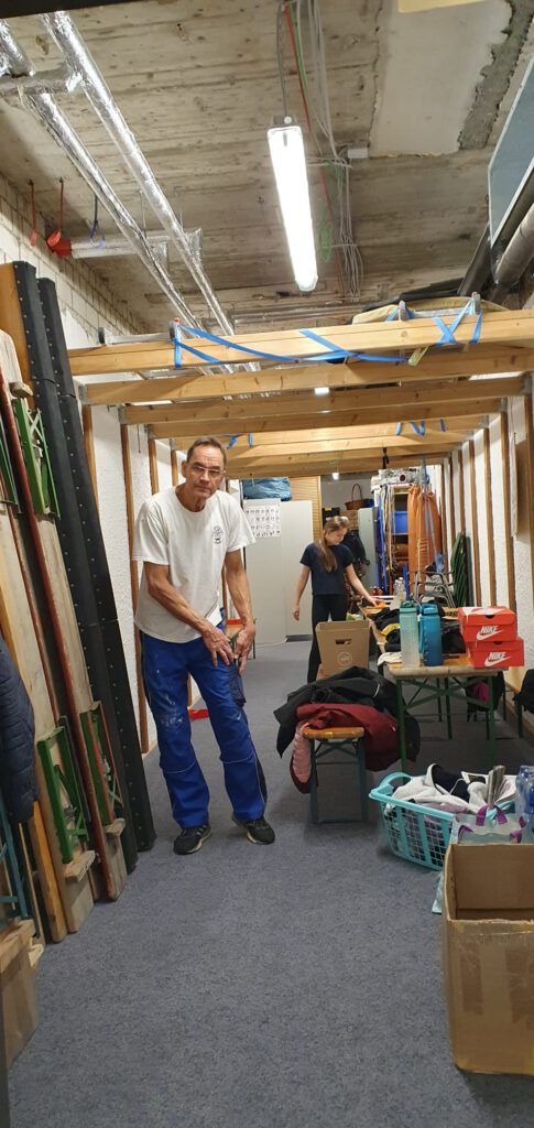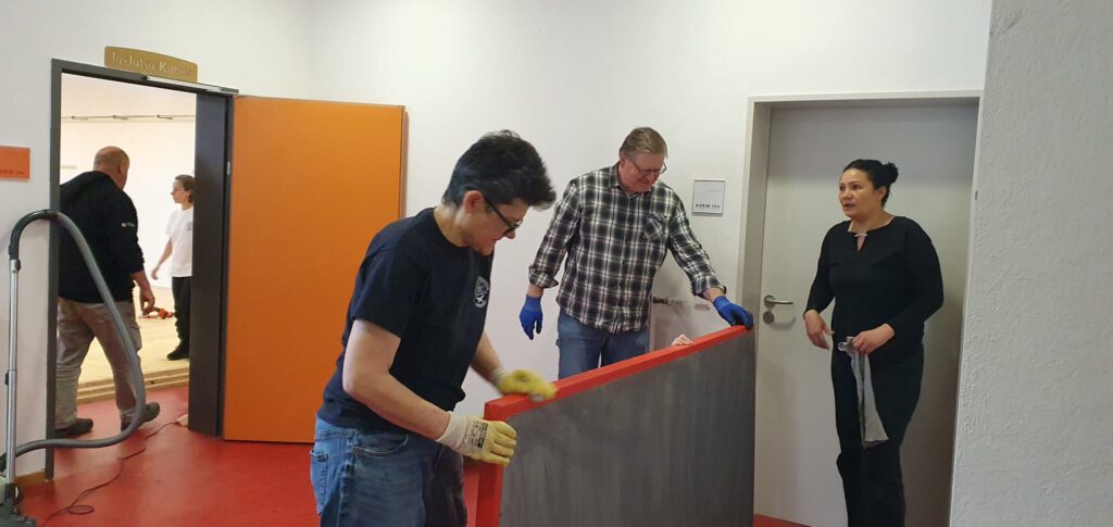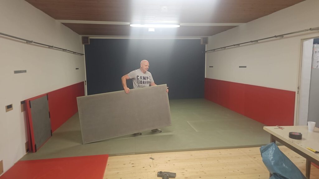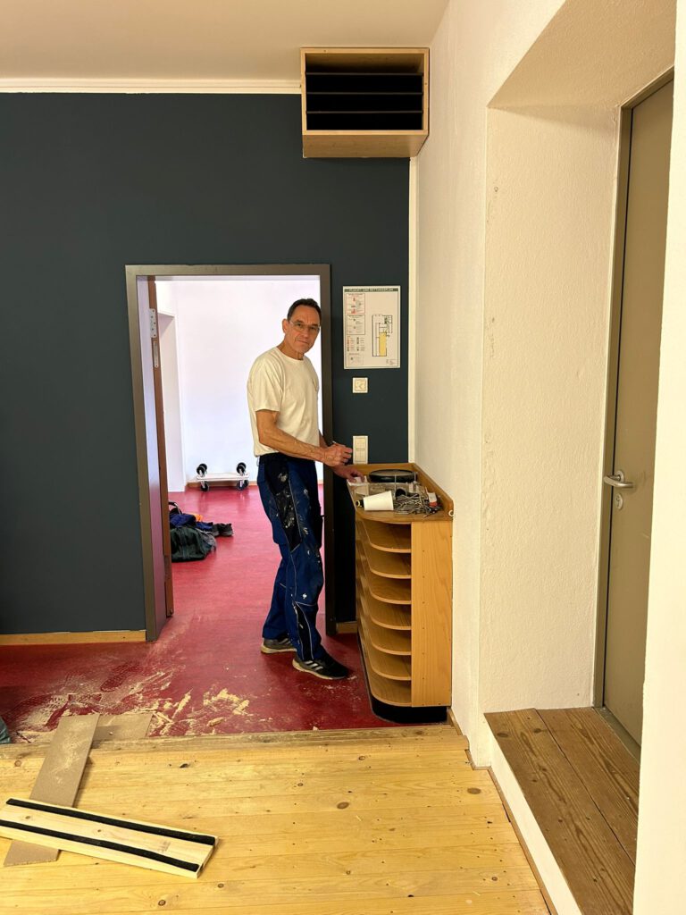 Bereits am Montag packten zahlreiche Helferinnen und Helfer tatkräftig an. Das Dojo wurde vollständig ausgeräumt, alte Mattenumrandungen demontiert und entsorgt sowie die Bodenmatten entfernt, gereinigt und vorbereitet. Zudem wurden Bilder und Schautafeln abgehängt, erste Spachtelarbeiten durchgeführt und die Umkleidekabine gründlich gereinigt. Ein besonderer Dank gilt hier unserem Malermeister Roland, der die Umkleidekabine noch am selben Tag fachgerecht gestrichen hat.